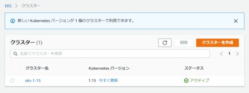 検証なんかでeksctlでバージョン指定してKubernetesクラスタを作成したいときは、--versionを使用する。 $ time eksctl create cluster \ --name eks-1-15 \ --region ap-northeast-1 \ --nodegroup-name eks-ng-1-15 \ --node-type t3.micro \ --nodes 1 \ …